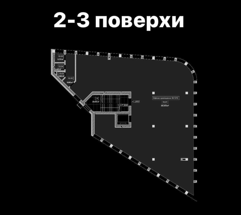 2-3 поверхи-open space, більш ніж 300 м2 кожен поверх