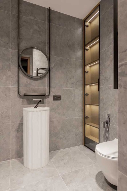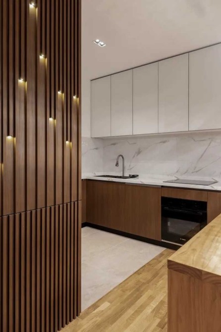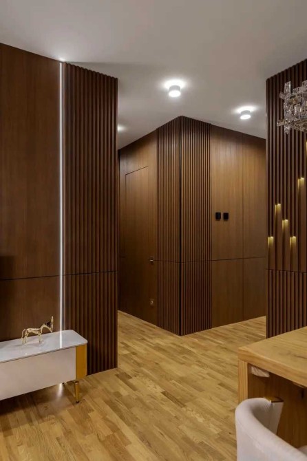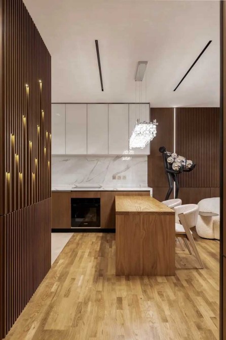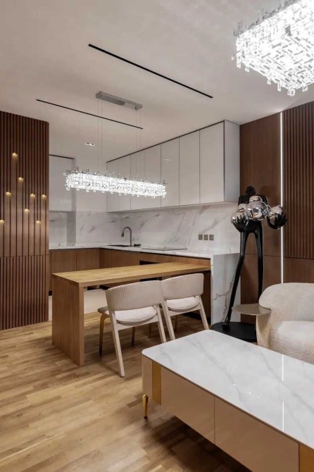 У ремонті використано високоякісні матеріали преміум-класу, багато декоративних елементів і різнорівневе освітлення.