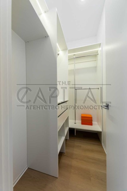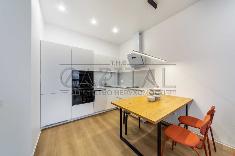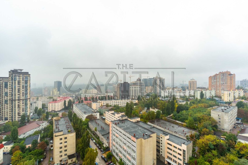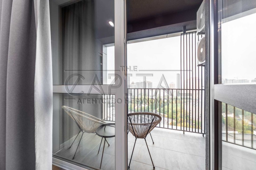 Планування: кухня-вітальня з виходом на терасу, спальня з гардеробною, простора ванна кімната. Високі стелі, панорамні вікна та краєвид на центр Києва і вечірні заходи сонця.