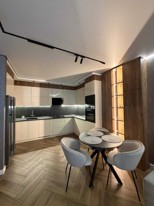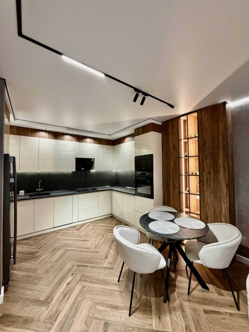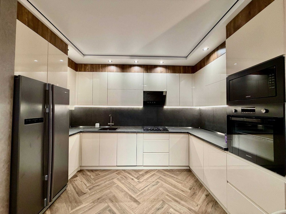• Кухня: вбудовані меблі з глянцевими фасадами, великий холодильник Side-by-Side, духова шафа та мікрохвильова піч Samsung, посудомийна машина.