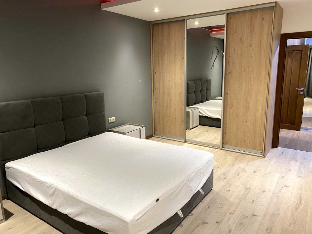 У спальні комфортне ліжко, тумбочки і велика шафа.