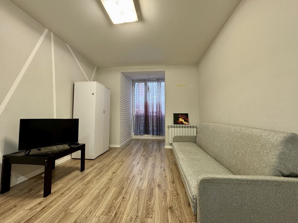 Кімната: двоспальне ліжко, диван( розкладається), робочий стіл, столик, телевізор, шафа, пилосос. Освітлення по зонам.