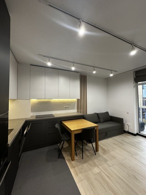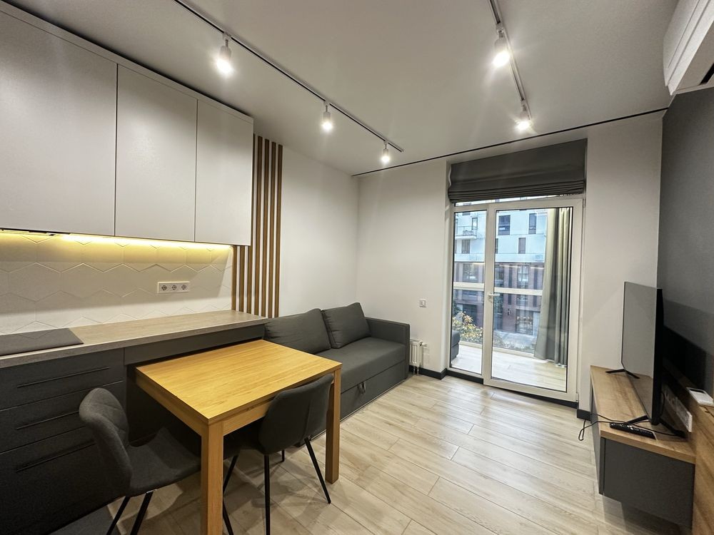 Стильна дизайнерська 2-х квартира-студіо в новому ЖК Файна Таун на вул. Салютна, 2г (15 хв. від метро Нивки пішки). Є балкон з видом на променад, дуже комфортно і тихо, всі ремонти закінчились в домі декілька років тому.