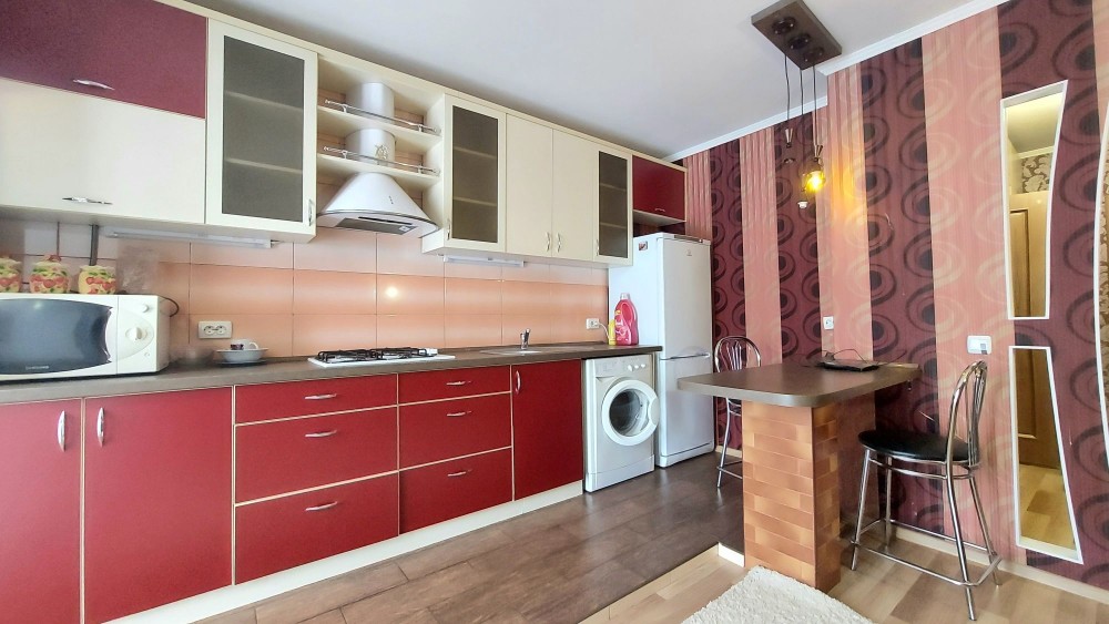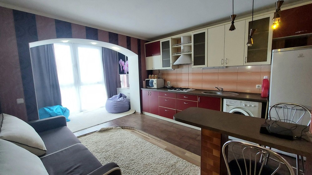Кухня укомплектована меблями, газова плита, стіл, стільці, холодильник, пральна машина, розкладний диван.