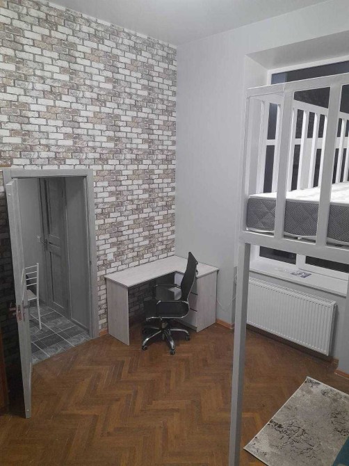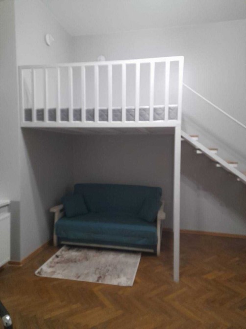 Перша здача в оренду. Новий ремонт, все нове. Кімната функціонально поділена на зони: відпочинково-робоча зона з диваном та облаштованим робочим місцем на першому рівні та спальня, яка знаходиться на другому рівні. Висота стель 4 метри.
