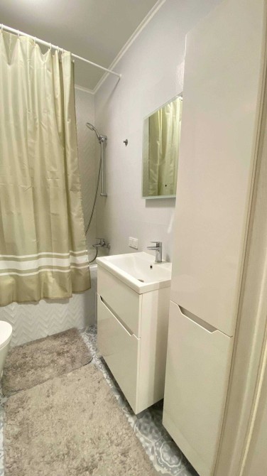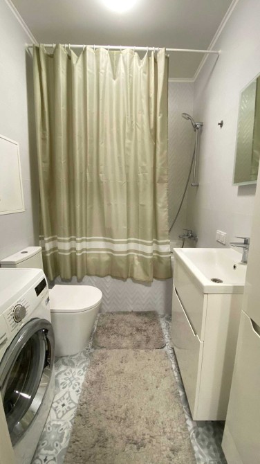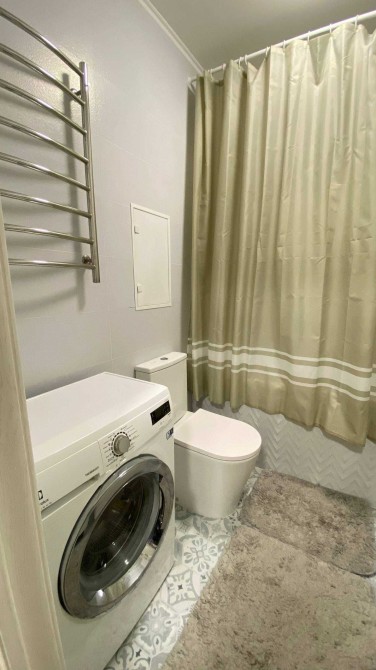 Ванна кімната обладнана всім необхідним: пральна машинка, зручний вертикальний шаф, місце для зберігання речей.