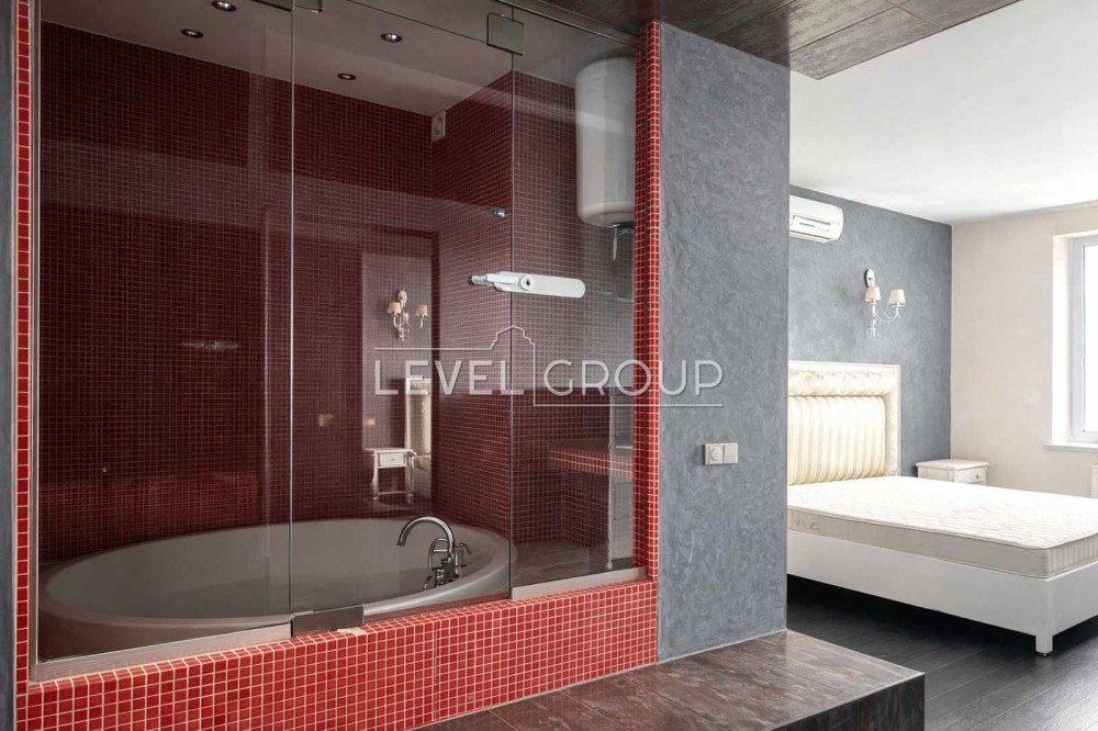 Ванна кімната відокремлена скляними прозорими перегородками, що візуально зберігають простір