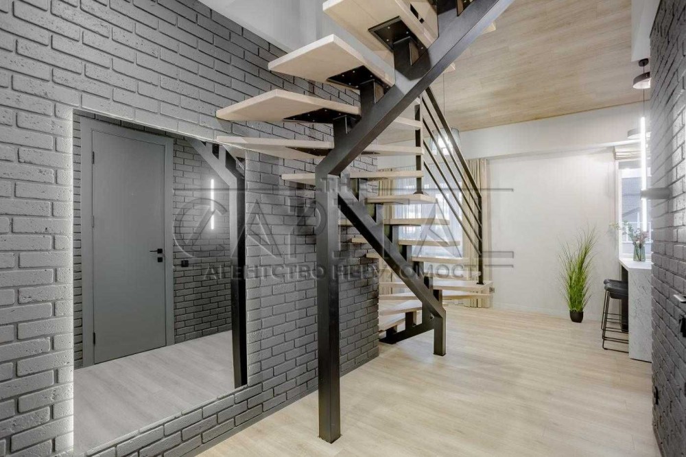 Виконано якісний дизайнерський ремонт. Є візуалізація з розстановкою меблів і декору. Встановлено ексклюзивні дизайнерські сходи з натурального дерева.