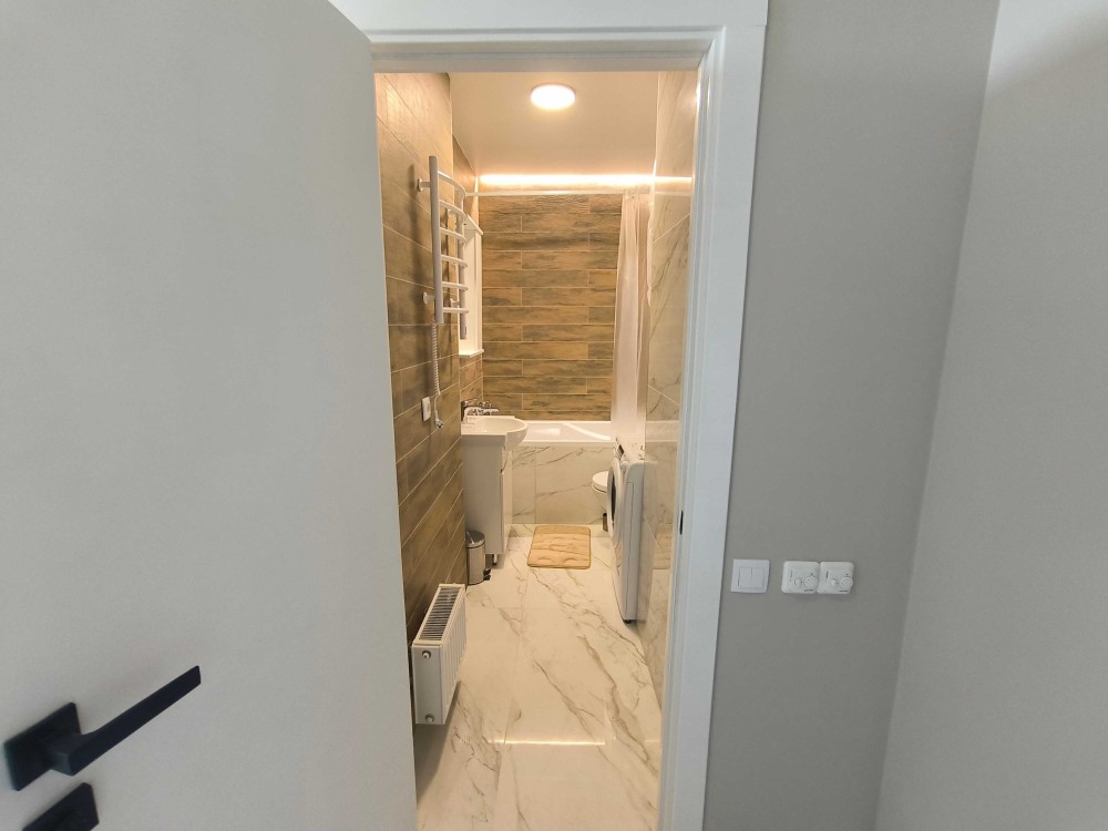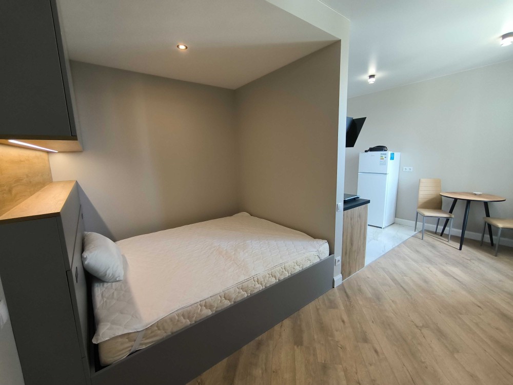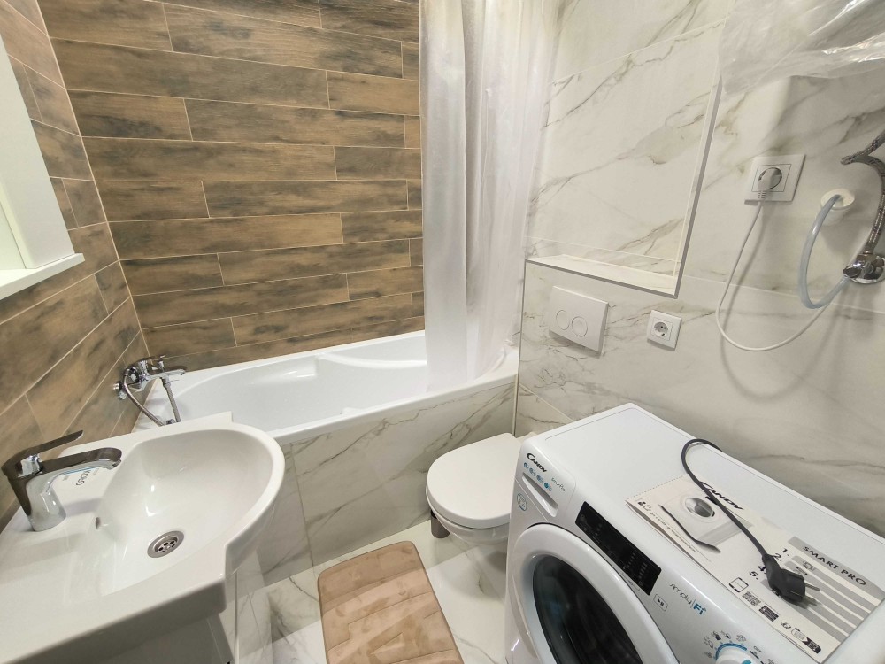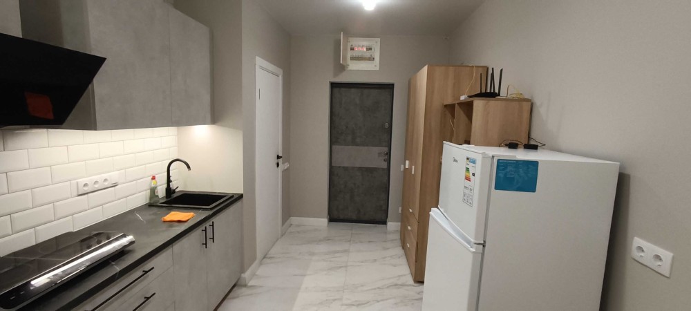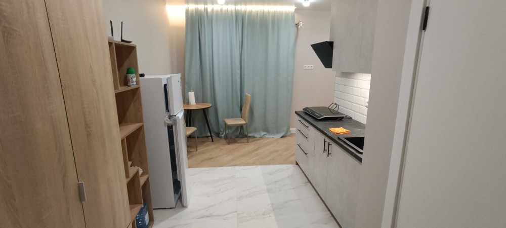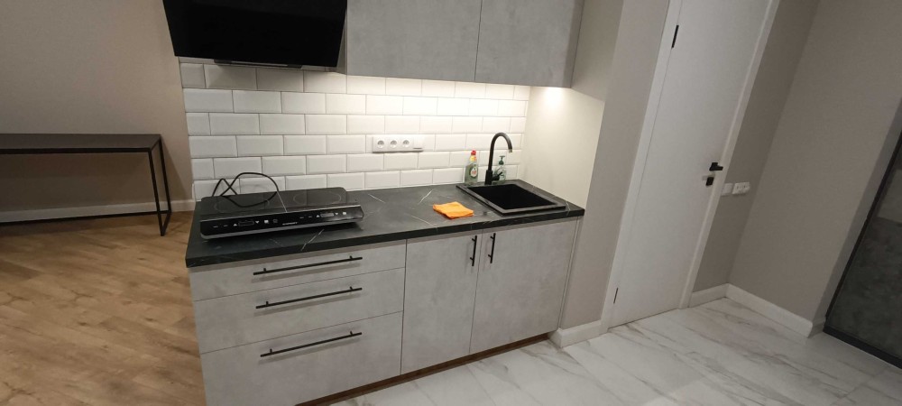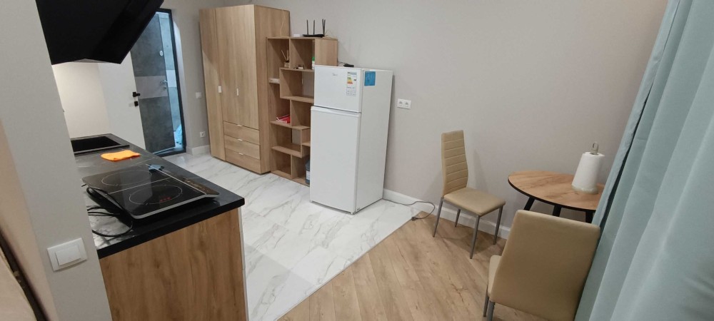 Оснащення: тепла підлога, велике ліжко, меблі, індукційна плита, холодильник, пральна машина з функцією WIFI-керування, проведено та підключено оптоволокно, WiFi, бойлер, витяжка на кухні та у вбиральні, шафа з полицями та шафа гардероб, стіл, стільці, є робоче місце.