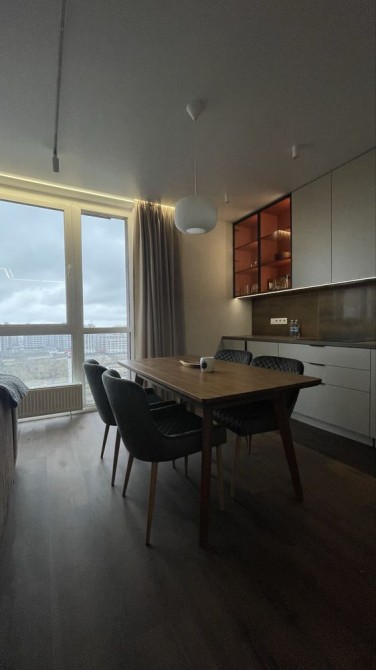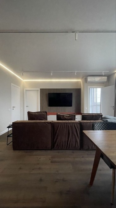 Кухня вітальня - комфортний диван, кондиціонер, ТВ 65 дюймів, стіл на 4 персони, велика робоча зона, витяжка, індукційна варильна поверхня, духова шафа, посудомийна машина, чайник, вбудований холодильник, шафи з скляними фасадами, чайник.