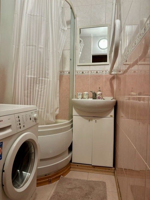 У ванній — душова кабіна та пральна машина.