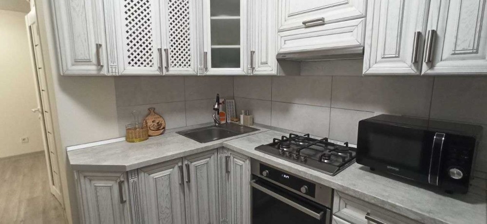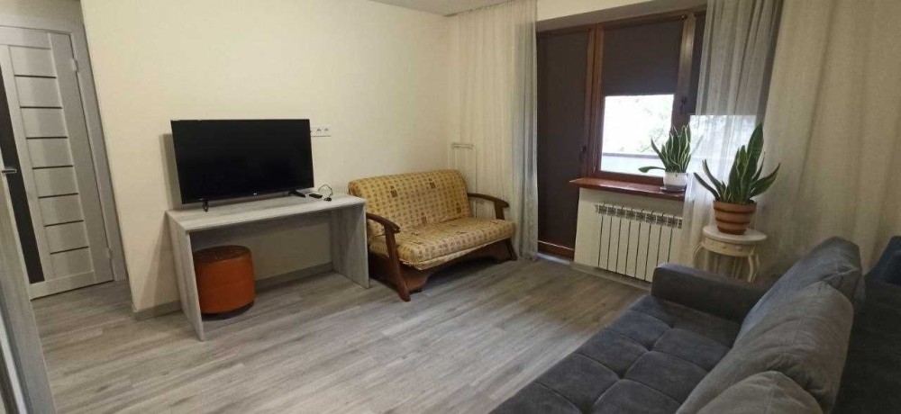 Планування зручне: окрема кімната з виходом на балкон, кухня та суміжний санвузол. Квартира повністю мебльована та укомплектована побутовою технікою: у кімнаті є 2 розкладних дивани, шафа-купе, телевізор та пилосос, кухня обладнана меблями, холодильником, мікрохвильовою піччю, пральною машиною, санвузол з душовою кабіною.