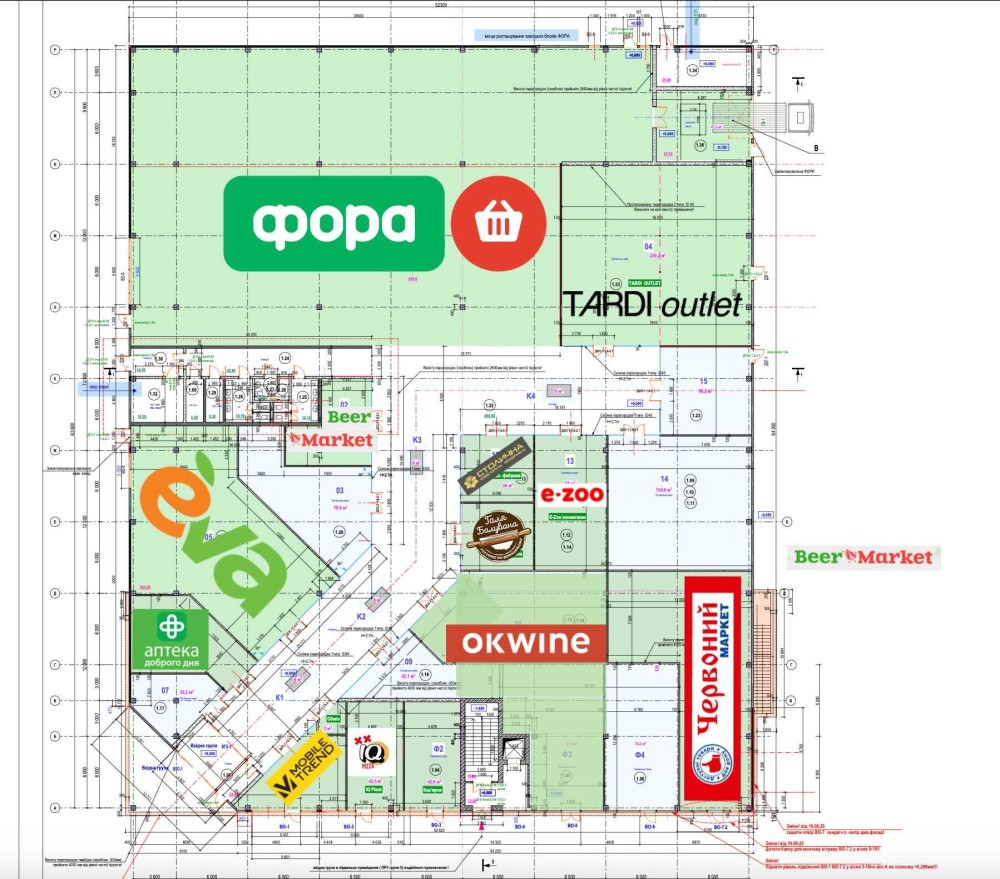 супермаркет «Фора», «Єва», «ОкВайн», «Ювелірний», «Червоний маркет», аптека, сухофрукти, «Мобілтренд», «IQ піцца», «Ber Market», «Е-Zoo», «Галя балувана».