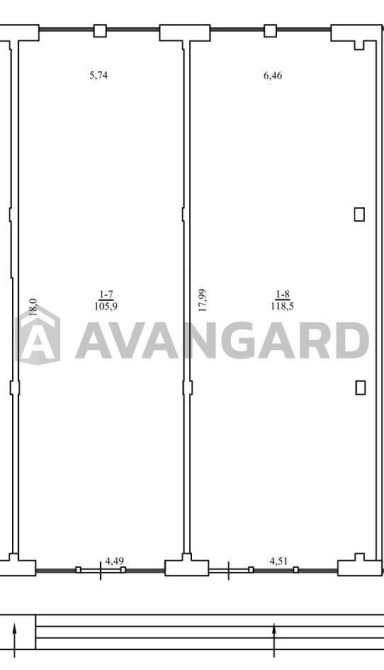 На плані приміщення розділено перегородкою. Наразі до половина від входу вона видалена, а натомість перпендикулярно їй приміщення розділили коридором. Є можливість відновити перегородку і виділити два приміщення 106м2 та 118м2. Кожне буде розділено цим коридором на 2 кімнати. (див. відео).
