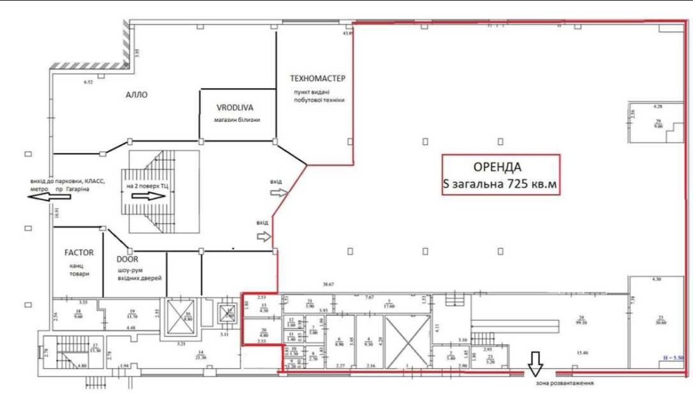 Опис: оренда торгових площ 725 кв.м. (можливо 795 кв.м.) на 1-му поверсі в ТЦ на пр. Аерокосмічний 20А (стара назава - пр. Гагаріна 20А).