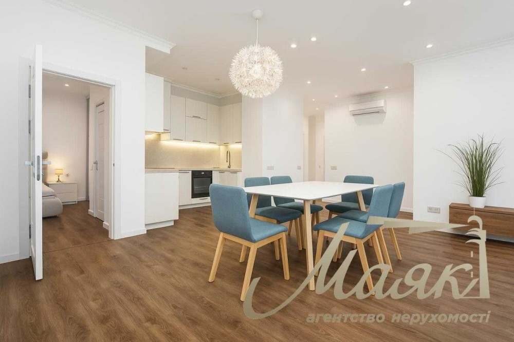Планування передбачає простору кухню-студію з вітальнею, дві окремі світлі спальні, гардеробну кімнату та два санвузли.