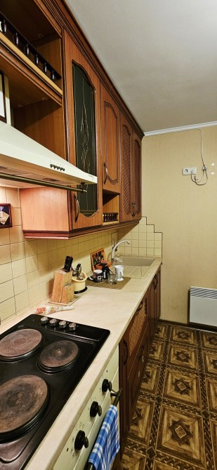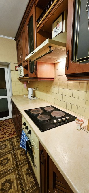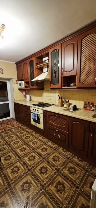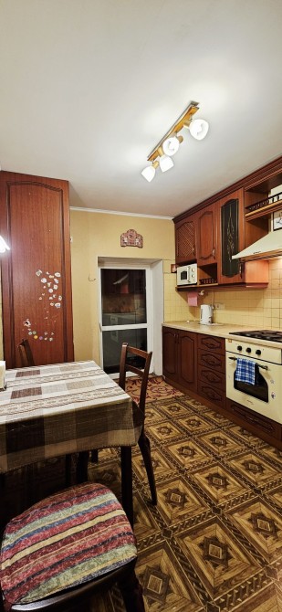 простора кухня мебльована , обладнана вбудованою витяжкою, електро варильною поверхнею, духовою шафою, холодильником, стіл та стільці.