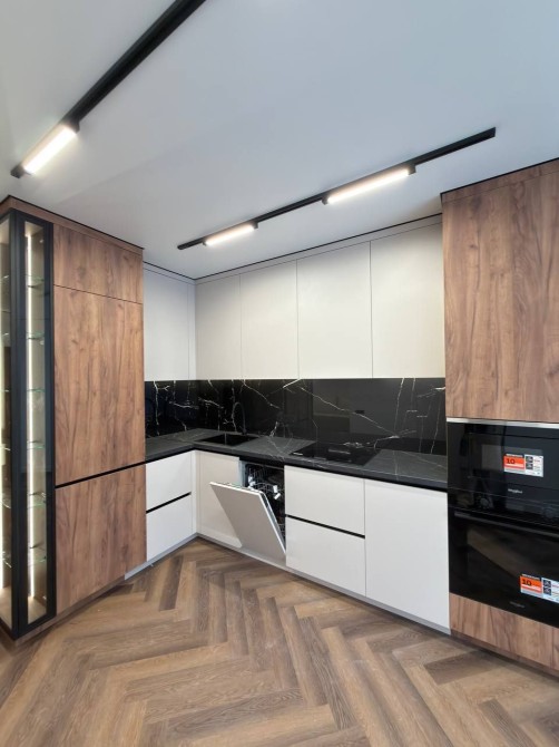 Кухня повністю укомплектована якісною вбудованою технікою: посудомийна машина, духова шафа, мікрохвильова піч. Є обідній стіл зі стільцями, що створює затишну атмосферу для сімейних вечерь.