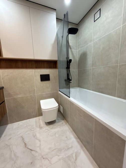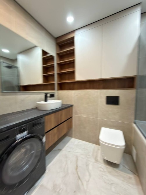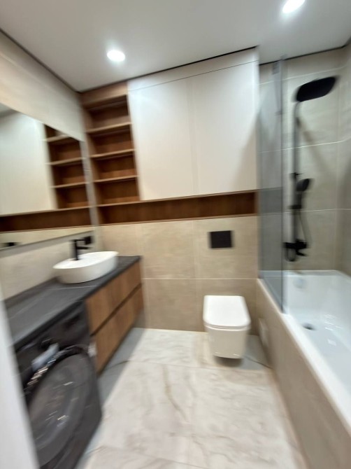 Ванна кімната простора, виконана в сучасних та теплих відтінках. Встановлена велика ванна, пральна машина, санвузол, умивальник — усе підібрано зі смаком та увагою до деталей.