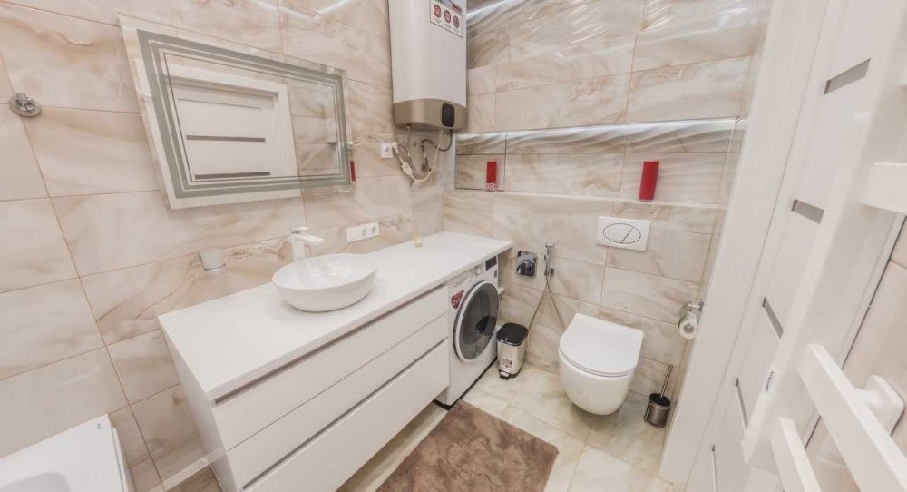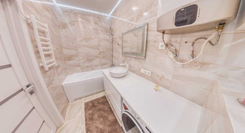 Санвузол сучасний і функціональний: душова зона, якісна сантехніка, пральна машина, бойлер.