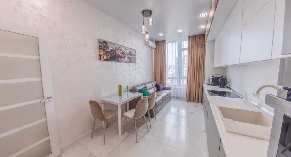 Квартира виконана у сучасній нейтральній стилістиці, з продуманим плануванням і великою кількістю світла. Простора кухня-вітальня обладнана всією необхідною технікою та зоною для відпочинку й обідів. Панорамні вікна наповнюють простір природним світлом та відкривають вид на місто.
