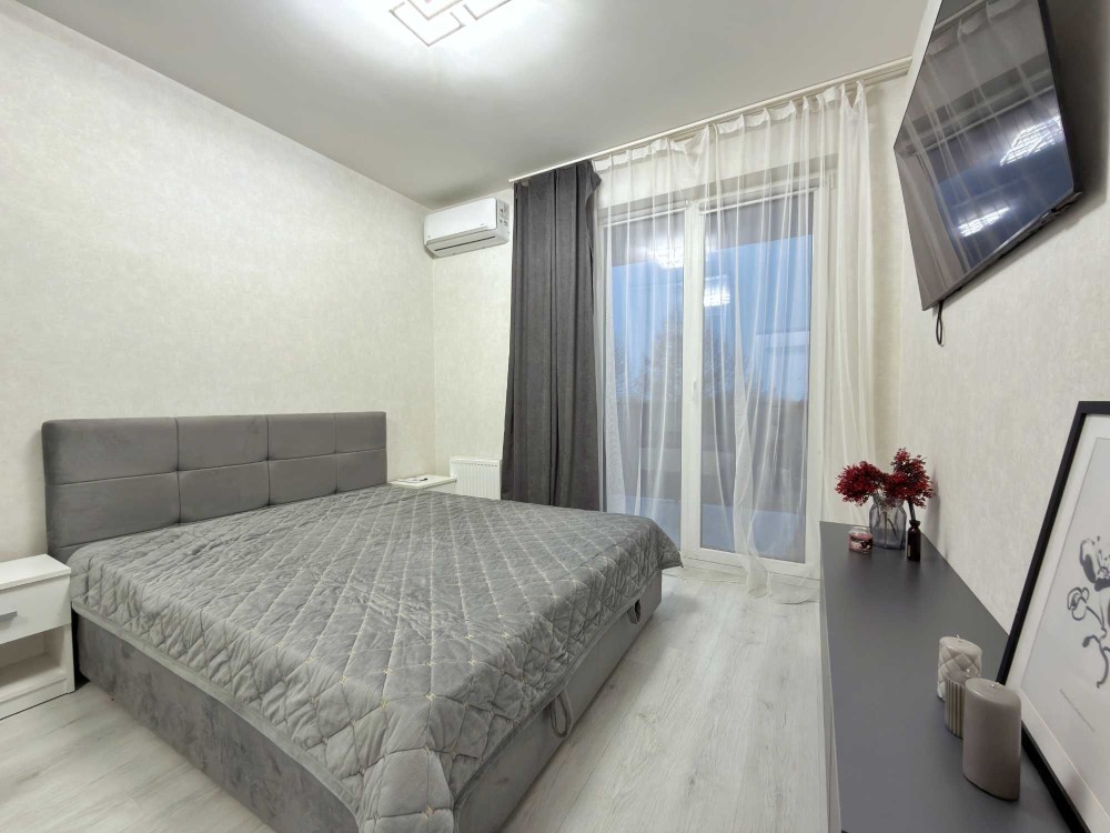 Спальня з двоспальним ліжком та TV, кондиціонером і виходом на балкон.