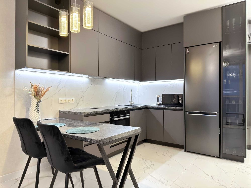 Кухня-студія з обідньою зоною, розкладним диваном та TV.