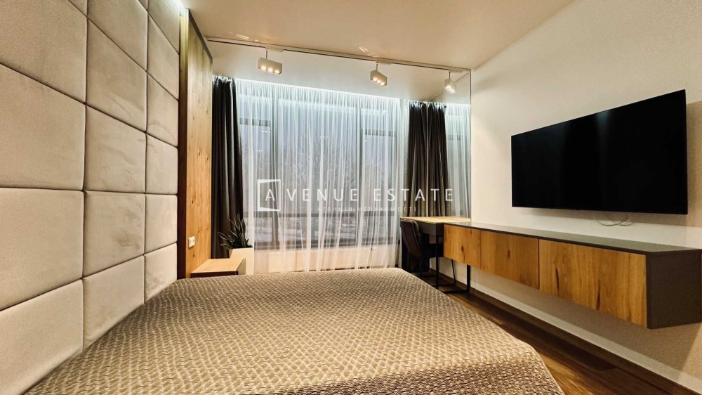 Окрема спальня: свій санвузол з ванною, велика вбиральня, двоспальне ліжко з ортопедичним матрацом, робочий стіл, смарт ТВ.