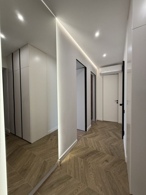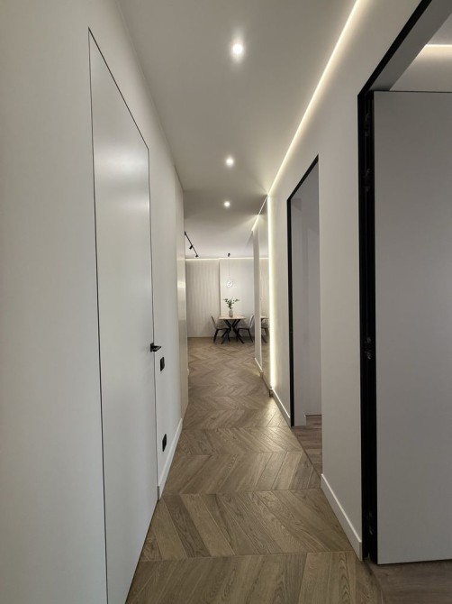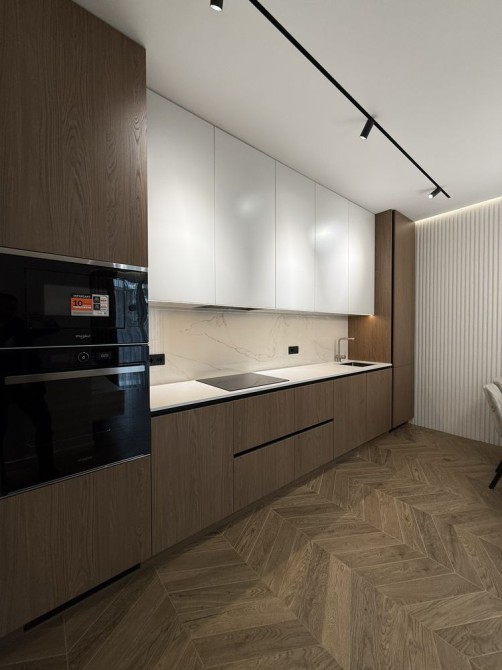 Квартира виконана у сучасному дизайнерському стилі з якісних матеріалів. Продумане освітлення, тепла колірна гама, ергономічне розташування меблів. Високі стелі та великі вікна забезпечують багато природного світла.