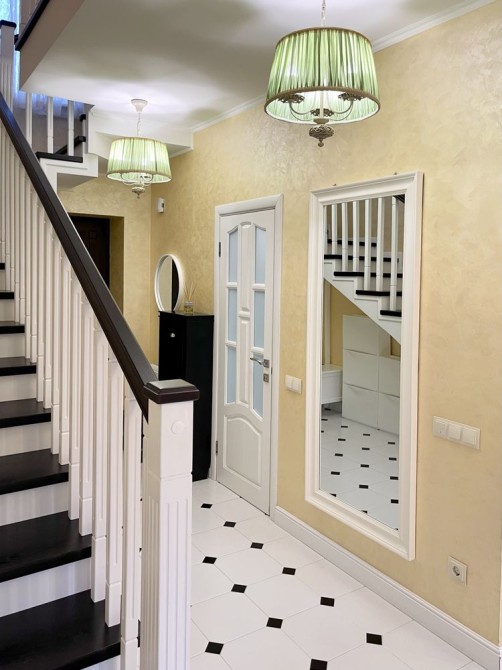 Перший поверх - кухня-вітальня та гостьовий с/в, другий - три окремі кімнати (спальня, дитяча, кабінет), гардероб та другий с/в.