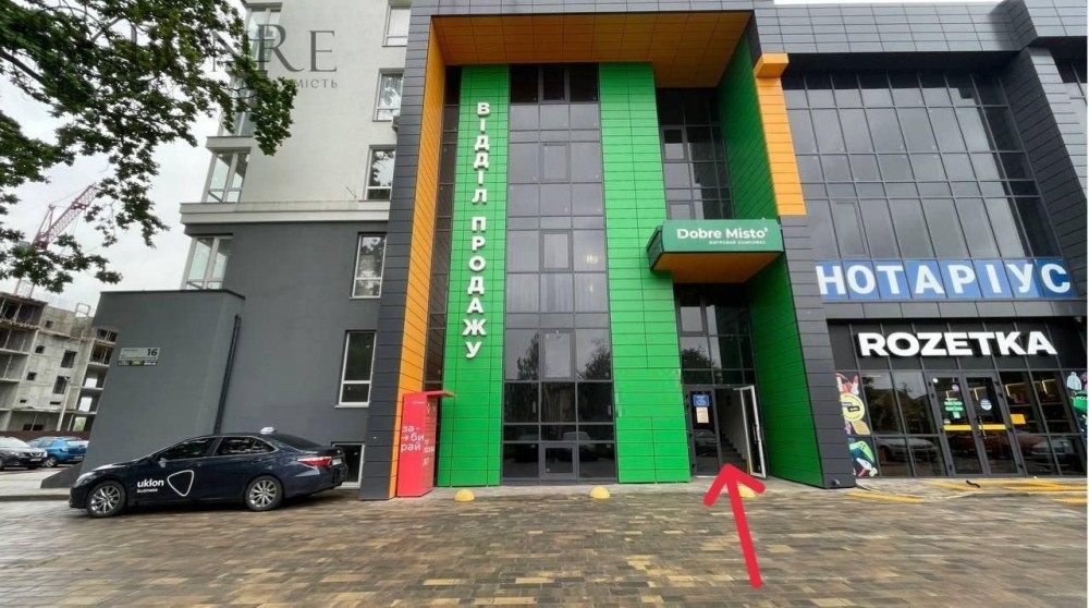 Поруч: зупинка громадського транспорту, парковка, вільний доступ відвідувачів (відкрита територія). Розетка, Нова пошта, кава бар, нотаріус, магазини, данс Клаб, Стоматологія, Лоток, Траш, Аптека.