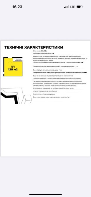 Промислові секційні ворота 4,3м з нульового заїзду. Потужність електроенергії 10кВт з можливістю збільшення.Є вода.Встановлена система протипожарного захисту.