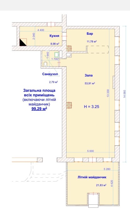 Площа торгова з терасою 99 м.кв., торговий зал 66 м.кв.