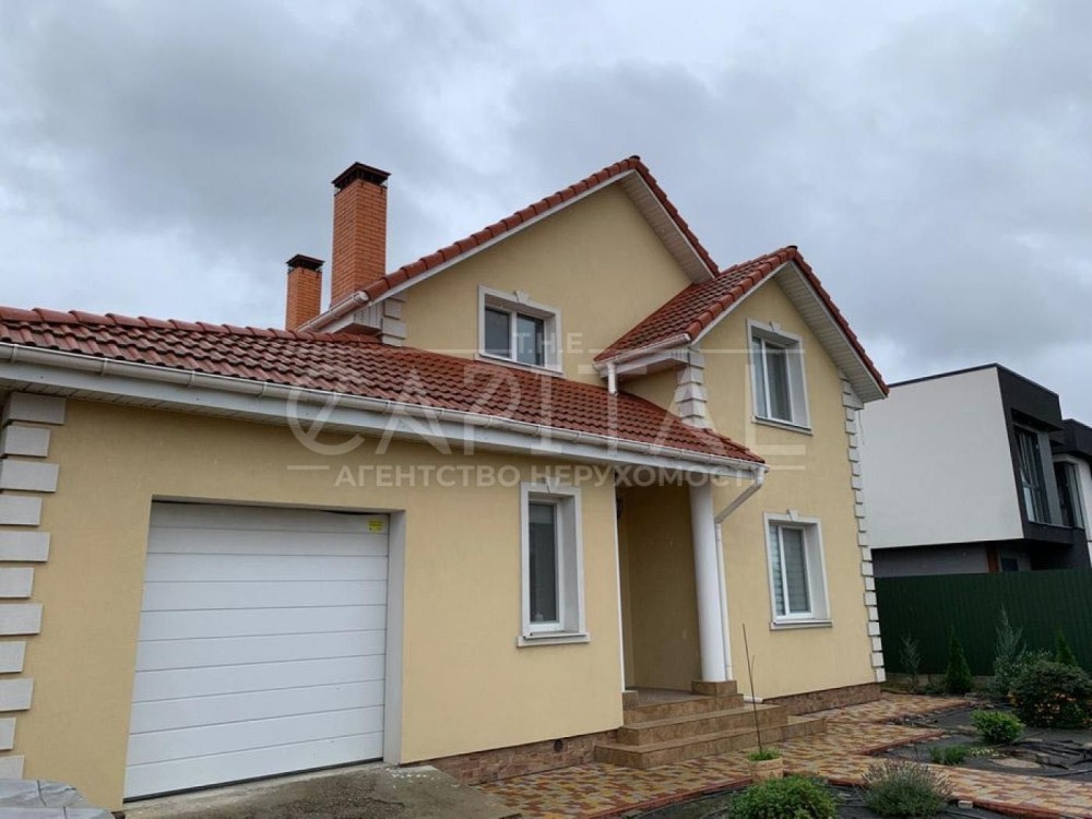 Загальна площа будинку з гаражем — 180 м², ділянка — 8 соток з ландшафтним дизайном і зеленою зоною.