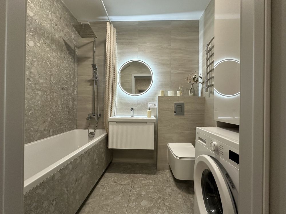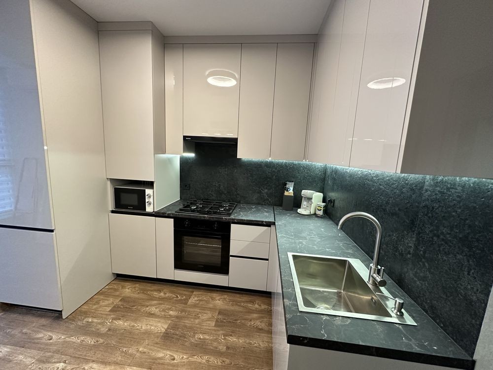 Деталі ремонтних робіт: якісне оздоблення стін, натяжна стеля, підігрів підлоги в коридорі, санвузлі, та в кухні, прально-сушильна машинка, підвісний унітаз. У кухні: вбудований холодильник, духова шафа, посудомийна машина, мікрохвильова піч