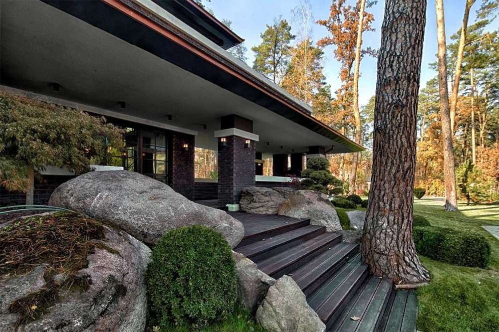 низька горизонтальна композиція, панорамні вікна, природні матеріали й тісний контакт з ландшафтом.