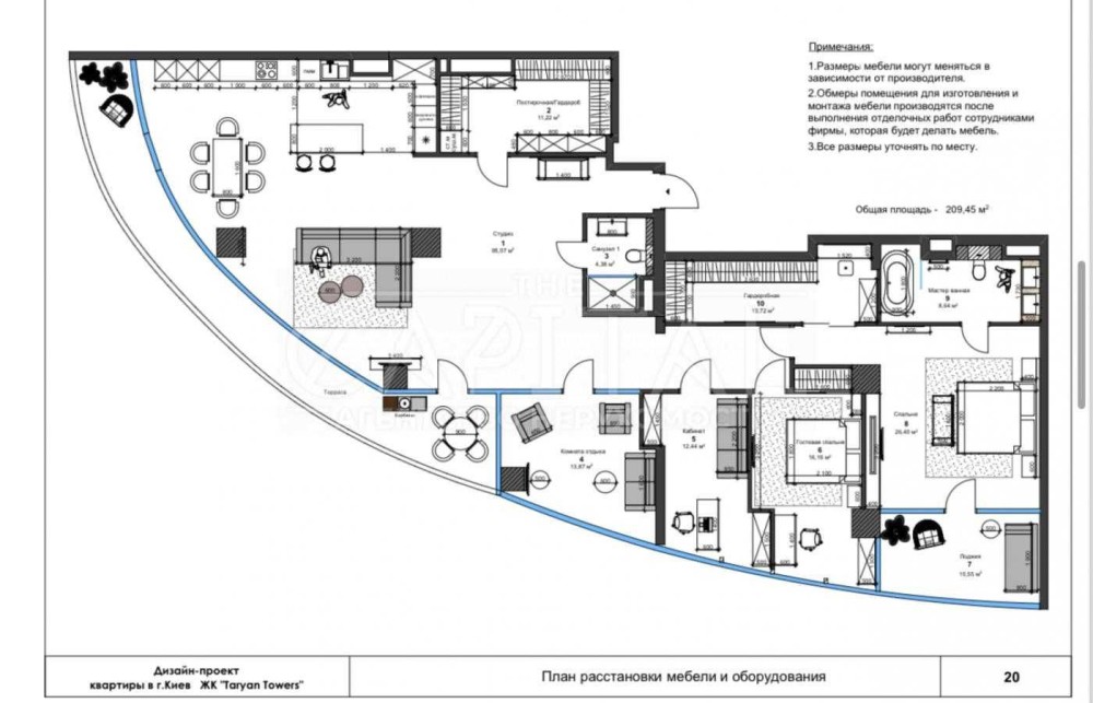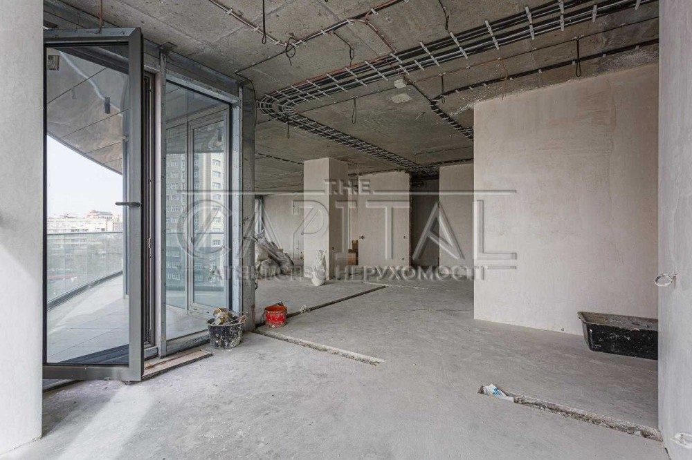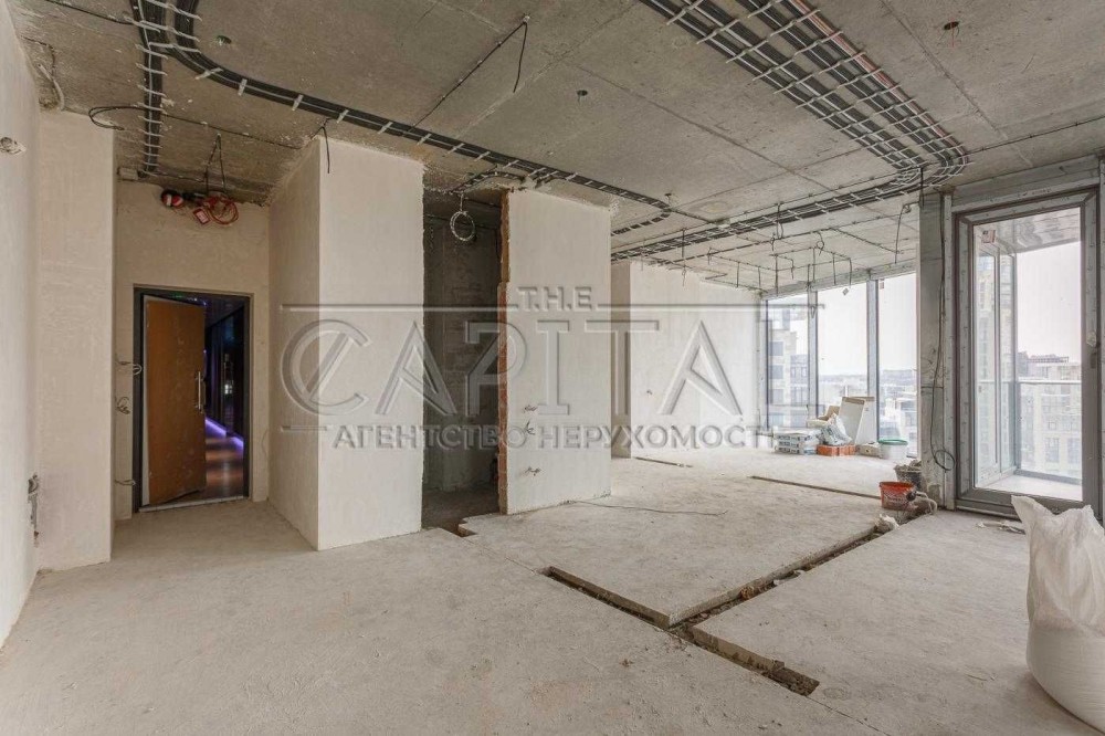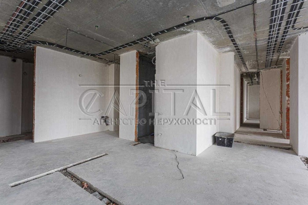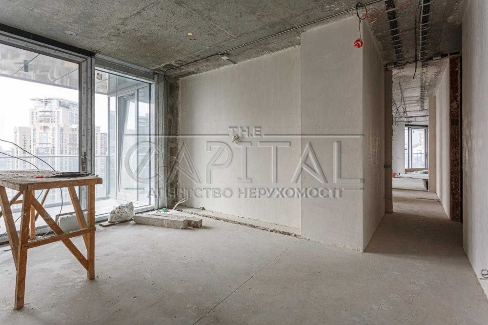 Кухня-вітальня 95м2, дві спальні кімнати(одна яка мастер кімната с лоджиєю), кабінет який можно переробити в кімнату,кімнатна видпочинку, 2 санвузли,2 великі гардеробні кімнати, велика тераса з прекрасним видом на Печерськ.