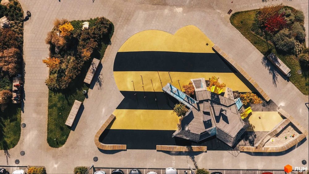- Подвір’я без авто, дитячі та спортмайданчики