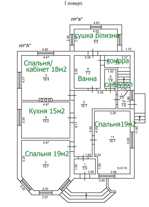 Загальна площа першого поверху 112 м² - три спальні по 19 м², кухня 15 м², два санвузли, підсобні приміщення.