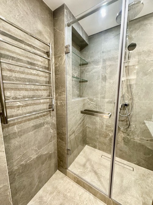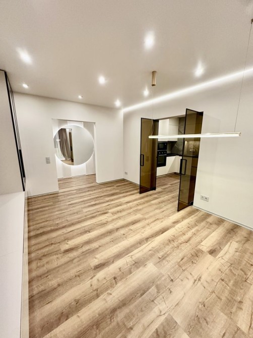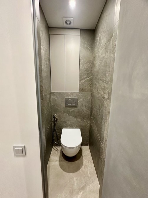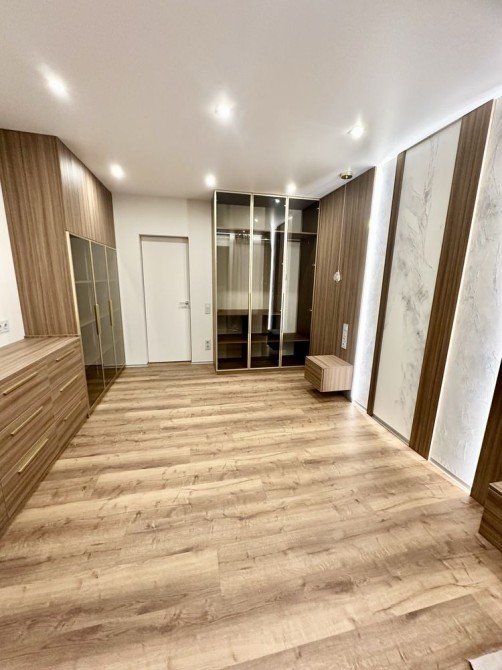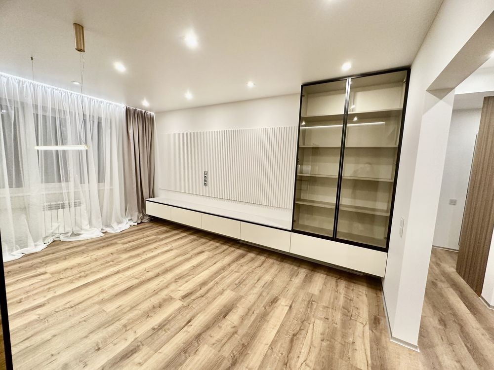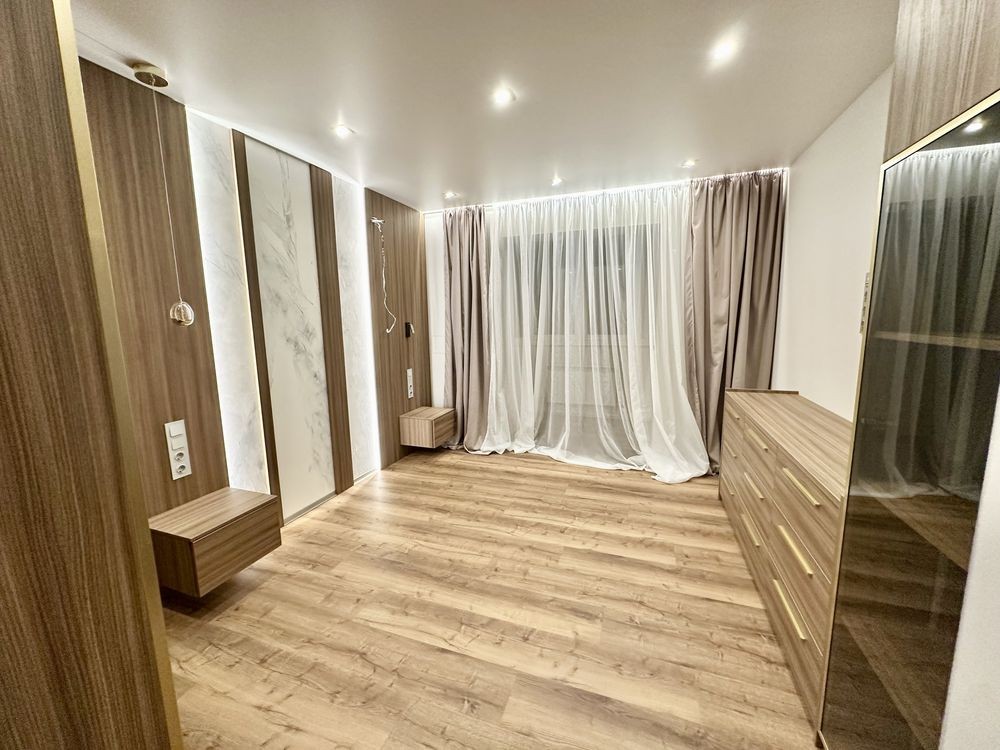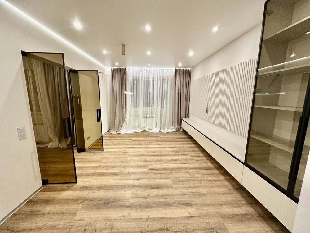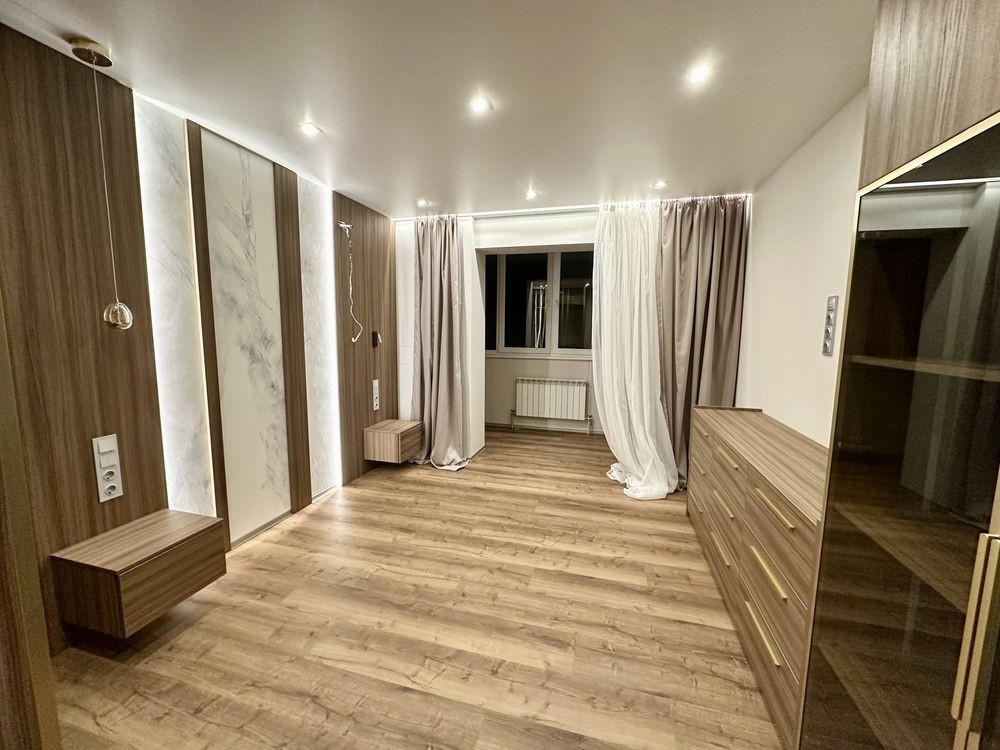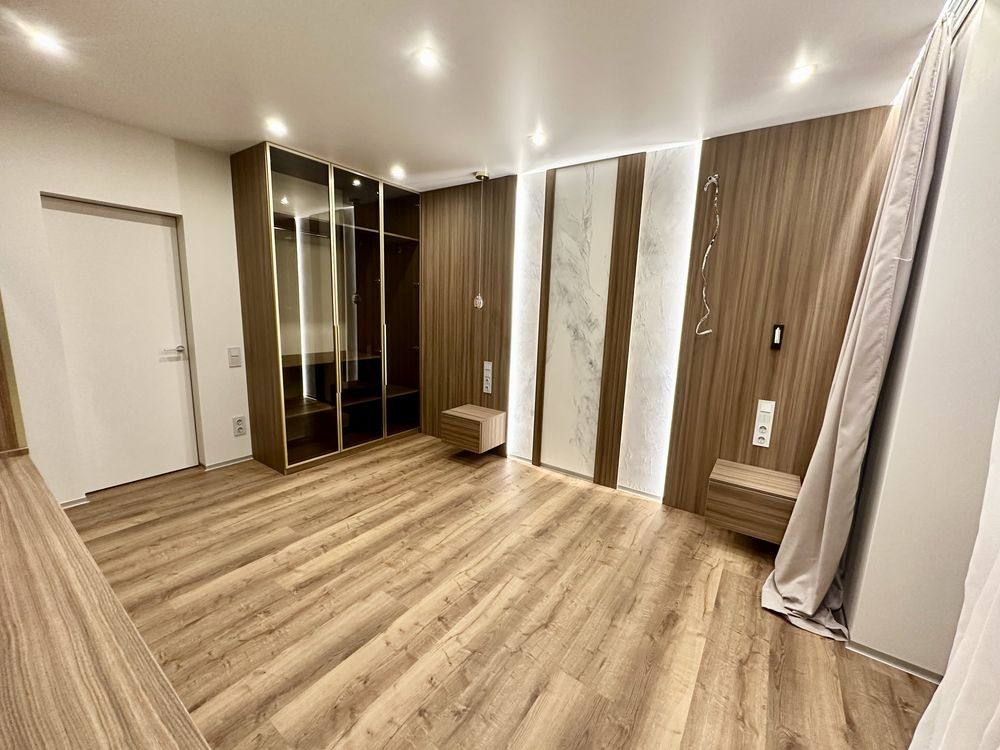 При ремонті використовували якісні матеріали: стіни покрашені, двері прихованого монтажу, тепла підлога в с/у, вбудовані якісні сучасні меблі (з доводчиками), 3Д суцільні панелі на стінах, освітлення для різного використання.