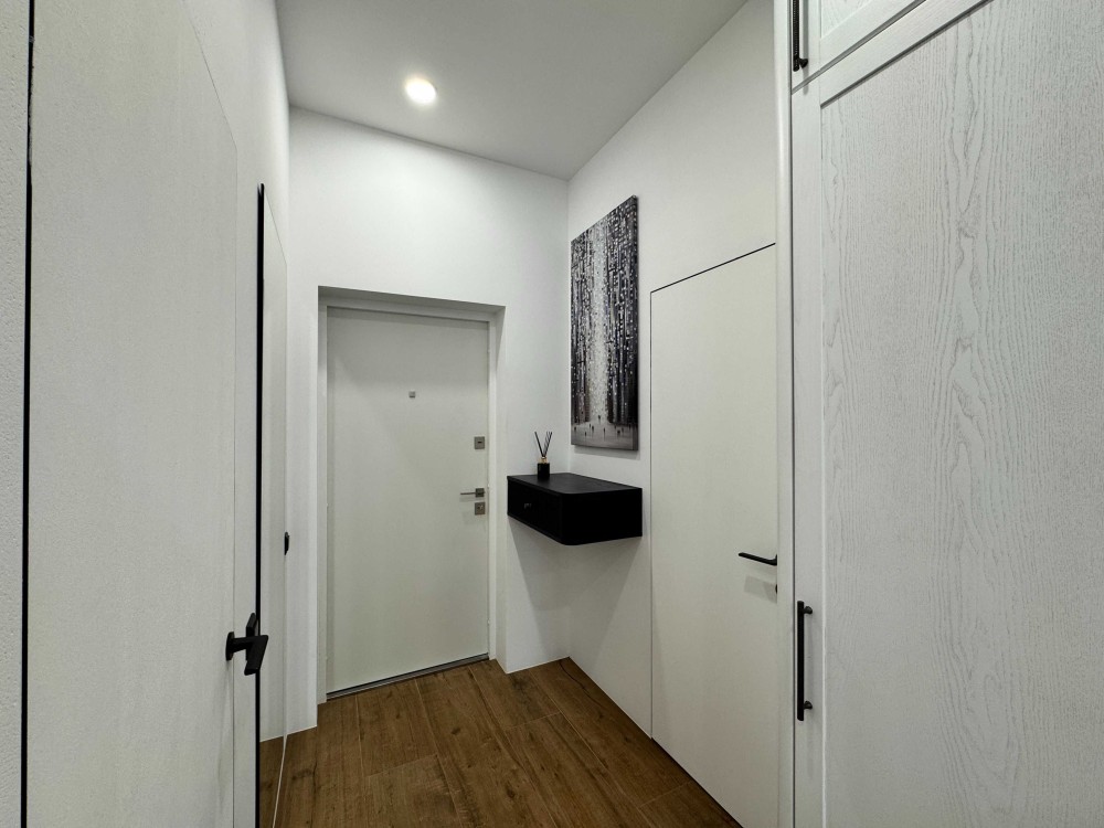 Планування: передпокій з невеликою гардеробною та шафою, ванна кімната зі зручним душем, кухня-вітальня з островом, спальня з шафою та невеликим балконом.