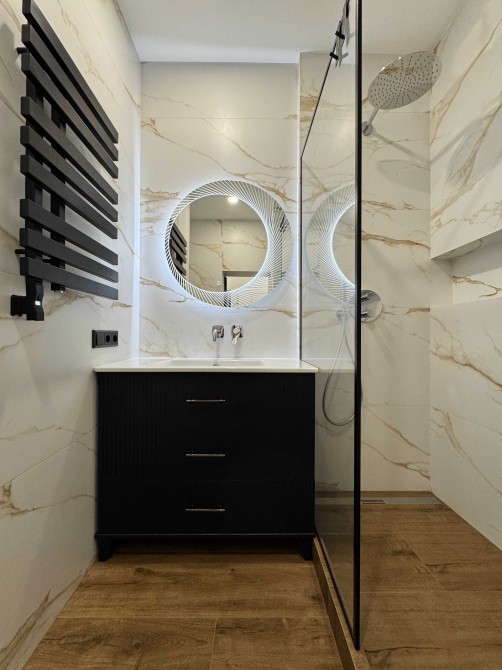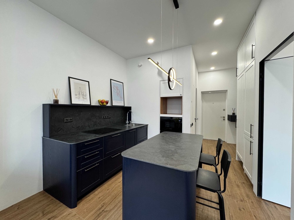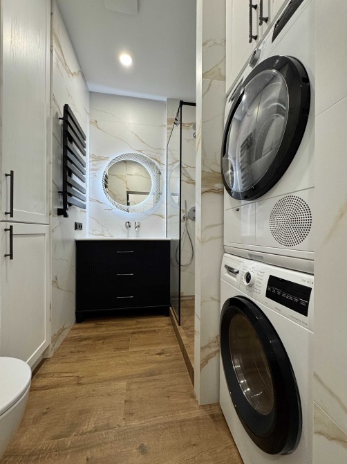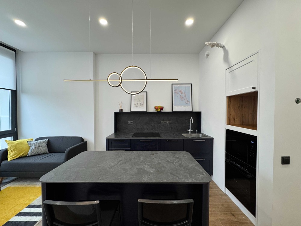 Квартира гарно укомплектована: бойлер, пралка та сушильна машини, вбудовані духовка та мікрохвильовка, посудомийна машина, вар. поверхня індукційна з вбудованою витяжкою.