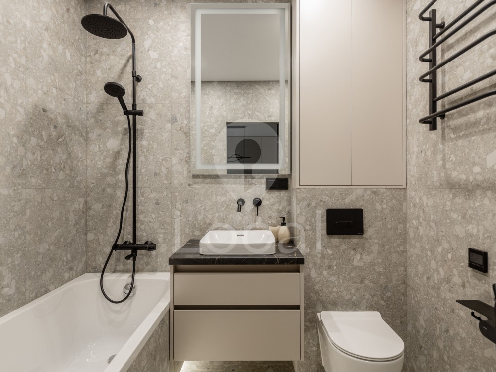 • Санвузол: ванна, бойлер, пральна машина, дзеркало з підсвіткою, рушникосушка і тепла підлога.