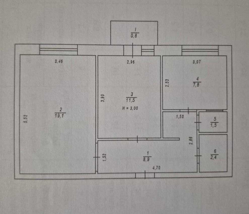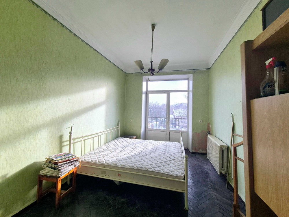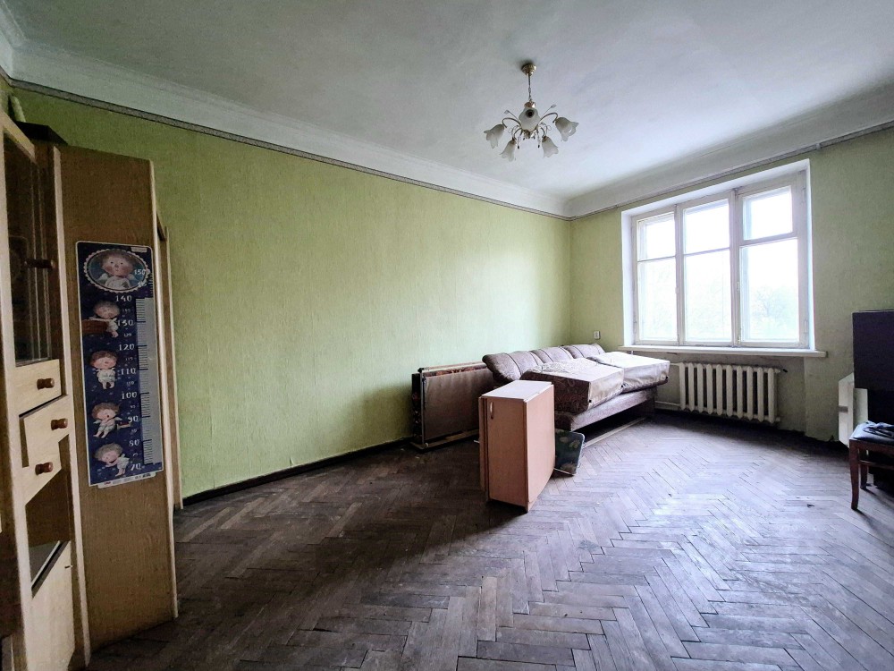 Розташована на зручному 2-му поверсі 5-поверхового цегляного будинку, загальна площа становить 52 м². Велика,простора кумната,на полу дубовий гарний паркет.