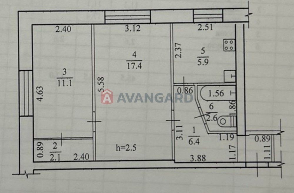 • Площа кухні 6 м2