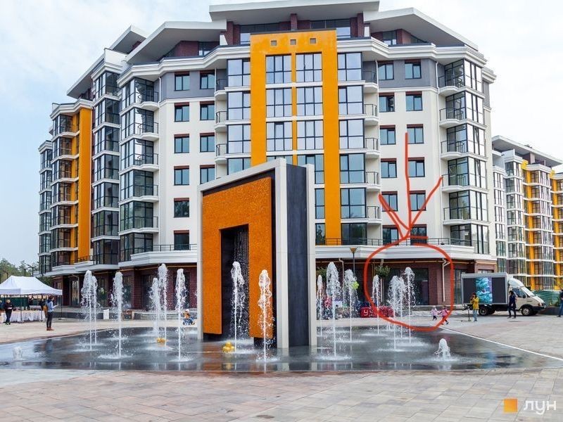 В теплий період року працює фонтан, який робить привабливою та затишною зону, де розташоване комерційне приміщення.