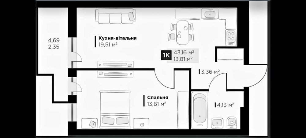 • Загальна площа 43.16 м2
