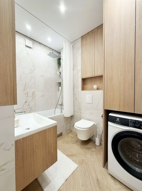 - Санвузол з ванною, гігієнічним душем, прально-сушильною машиною, бойлером та великою кількістю місць для зберігання.