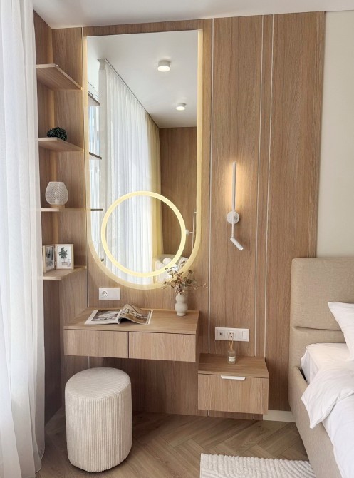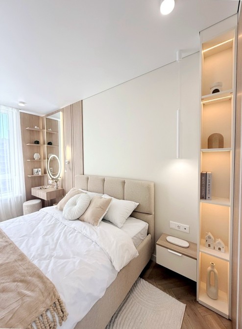 - Спальня з вбудованою шафою, великим ліжком з підйомним механізмом, робочим місцем та місцем для читання.
