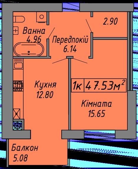47.5м2 / житлова 15.65 / кухня 12.8